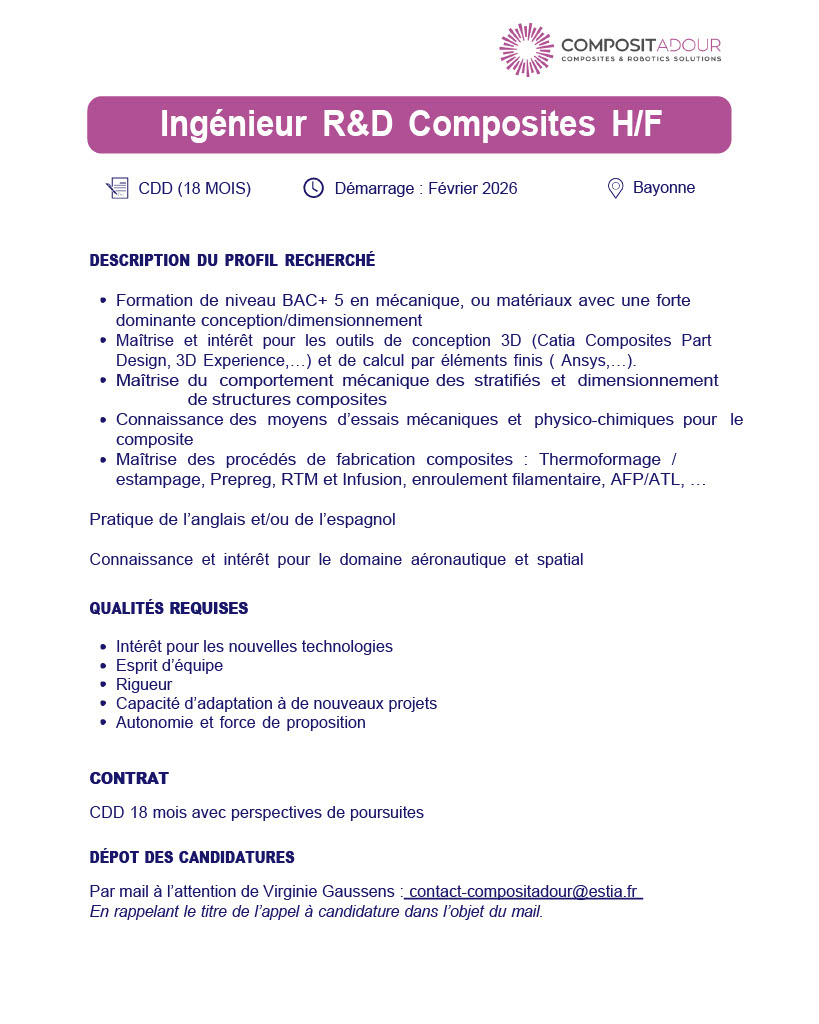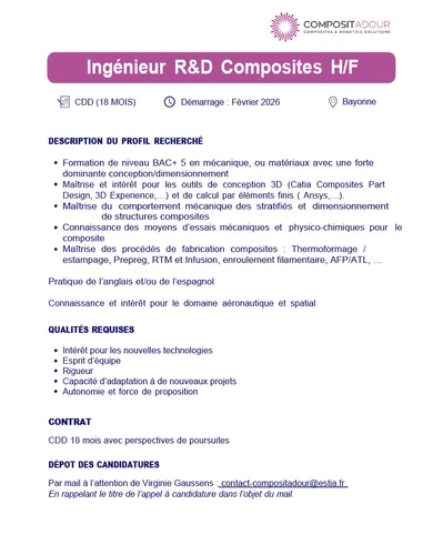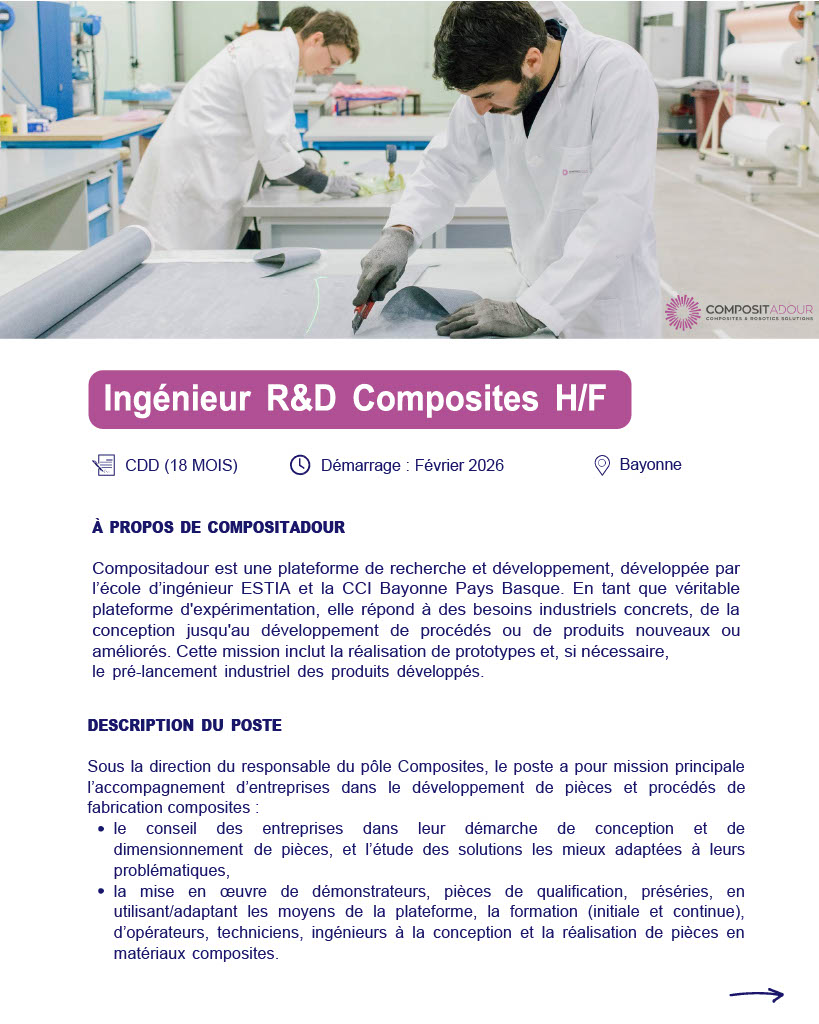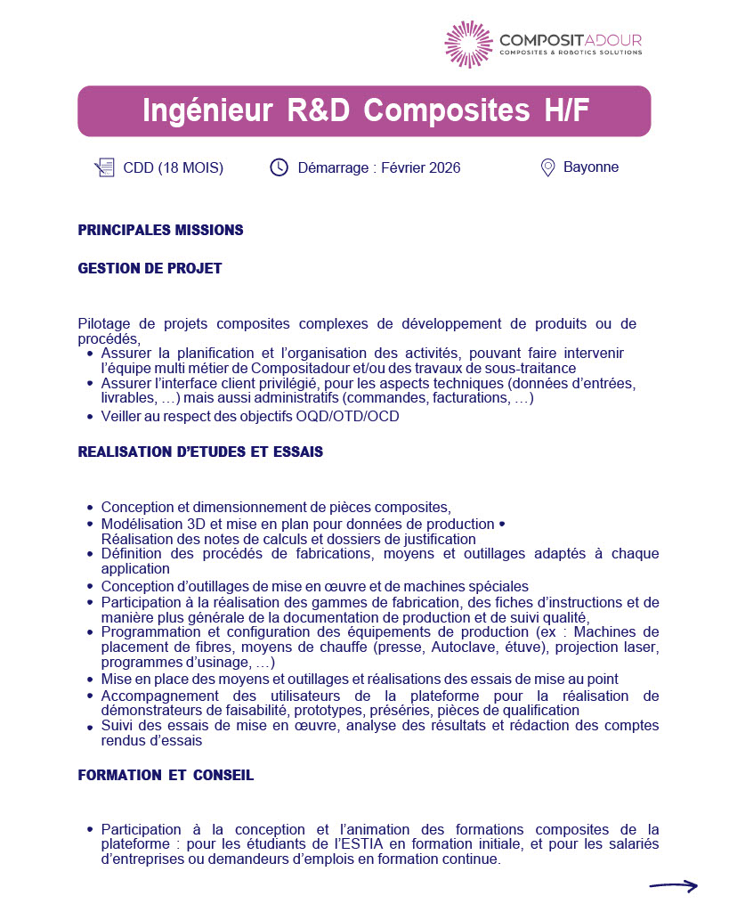 Dans le cadre du développement de ses activités, Compositadour recrute un·e Ingénieur·e R&D Composites pour renforcer ses équipes et contribuer à des projets de recherche et développement autour des matériaux et procédés composites.